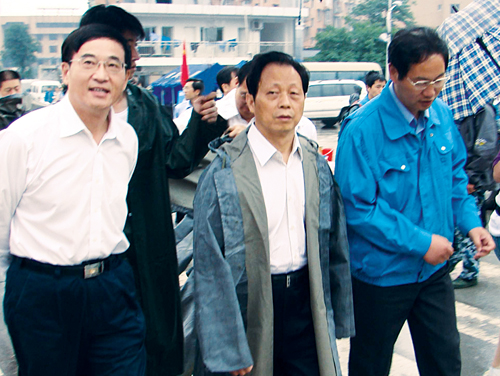 2008年5月29日,中國保監會主席吳定富(左二),在太保壽險董事長金文洪(左一)陪同 下,視察了太保客戶——德陽東方汽輪廠災情,吳定富勉勵太保繼續做好抗震救災理賠服務工作。