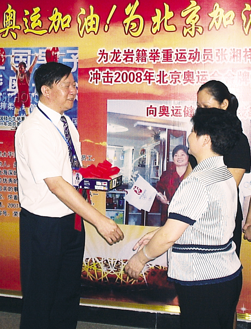張湘祥的母親黃玉曼(右)赴京之前,龍巖中心支公司總經理蔡霖(左)向其贈送數碼相機,并 為張湘祥加油,預祝他在比賽中取得成功。