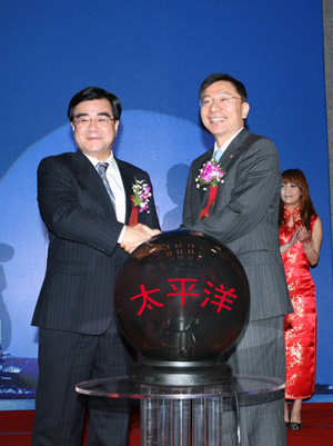 中國保監(jiān)會副主席周延禮(左)、中國太平洋保險集團董事長高國富為中國太平洋保險航運保險事業(yè)總部的成立揭牌。 2009年12月3日,由上海金融服務辦、上海保監(jiān)局、復旦大學、中國太平洋保險共同舉辦的航運保險(上海)國際研討會在上海西郊賓館召開。來自中國保監(jiān)會、上海市政府、上海金融辦、上海保監(jiān)局、上海市發(fā)改委、上海市建交委、上海市國稅、地稅局、上海市保險行業(yè)協會、中國海事仲裁委員會上海分會、中國船級社上海分社、交通運輸部、同業(yè)保險公司、國際再保險公司、銀行、公估行、律師、經紀人、航運機構、高校、學術機構及太平洋保險等單位150余人參加了會議。