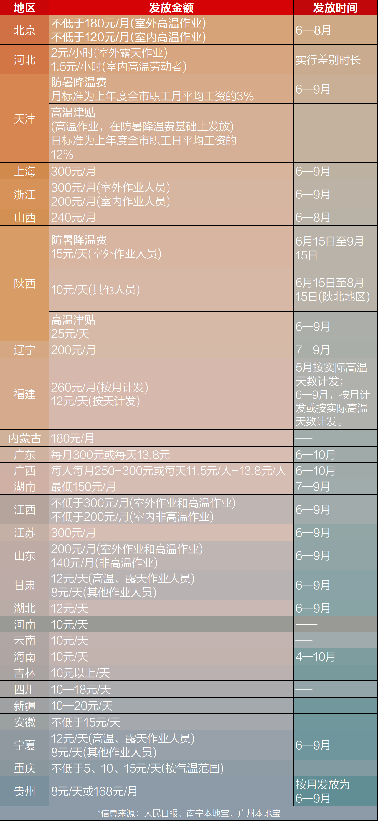 每個地區(qū),高溫津貼的領(lǐng)取時間、金額會有所不同,一般來說是有6、7、8、9四個月。