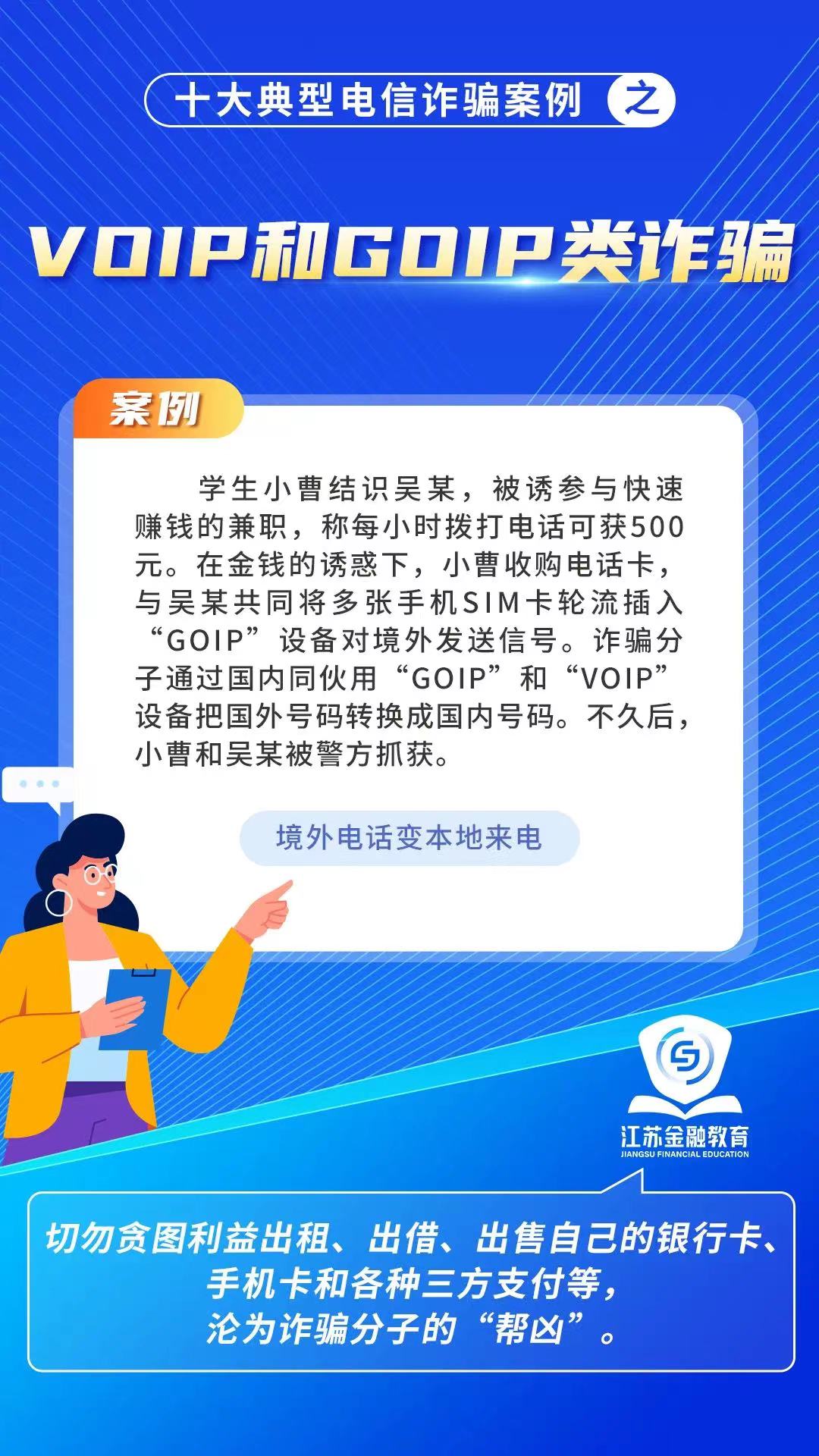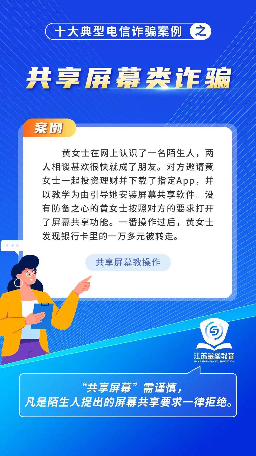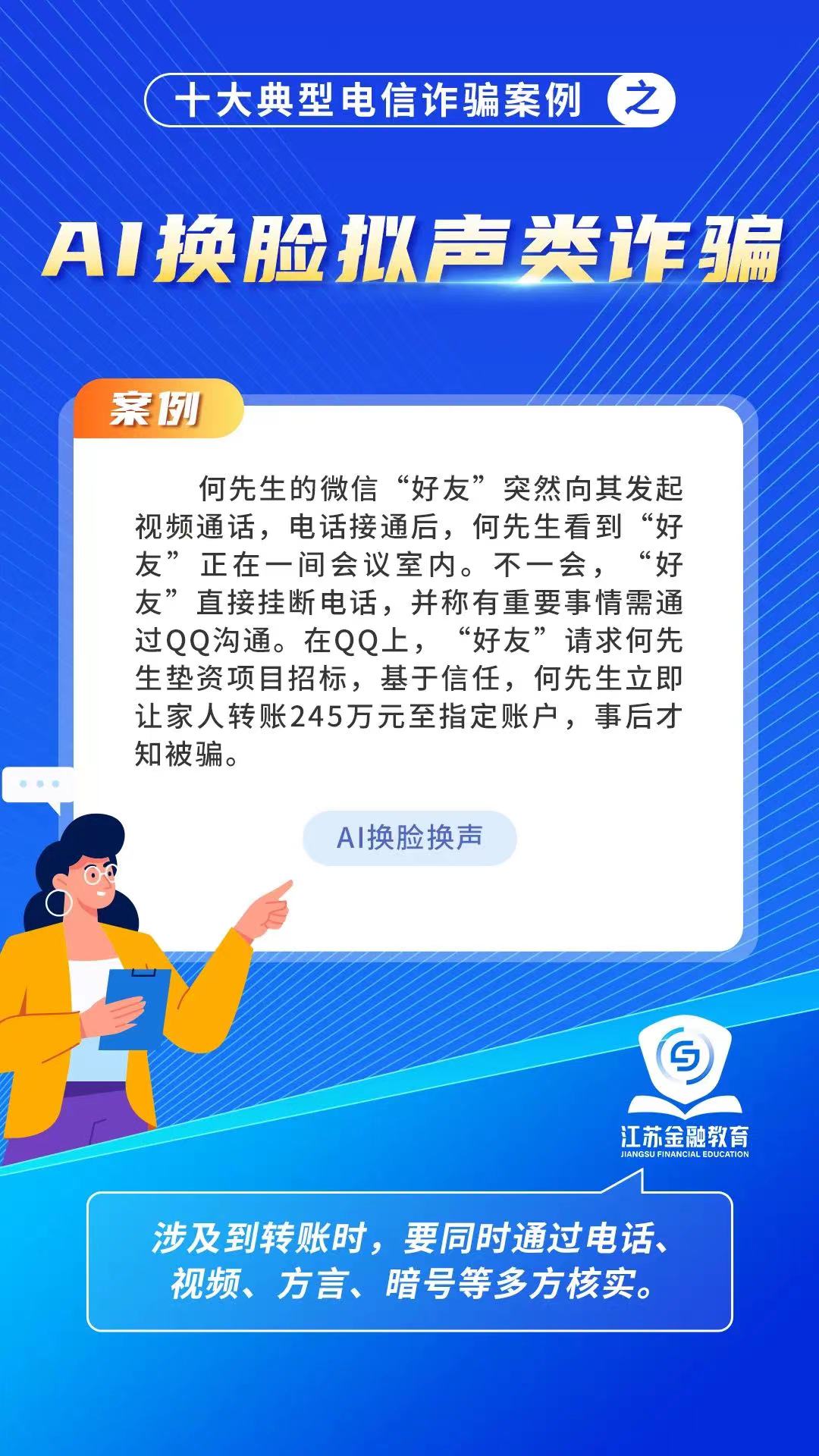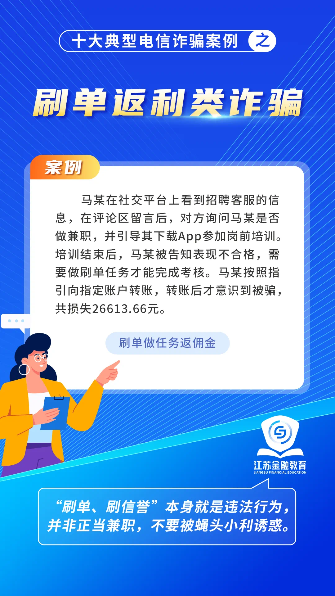 2024年江蘇“金融教育宣傳月”活動啟動儀式中,發布了十大典型詐騙案例,涵蓋了刷單返利、虛假網絡投資、虛假貸款等多種類型。以案例深刻剖析詐騙手法,提醒民眾警惕各類騙局,提高防騙意識,保護財產安全。