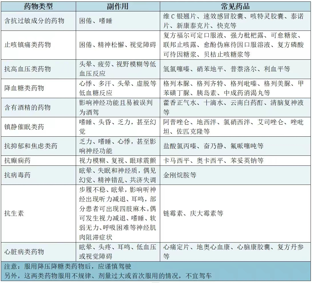 研究表明,一些藥品服用之后可能會產生嗜睡、困倦、心悸、反應遲鈍、視物模糊、注意力分散、血壓升高或降低、血糖降低等不良反應,這些都可能降低駕駛的安全性,甚至引發交通事故。