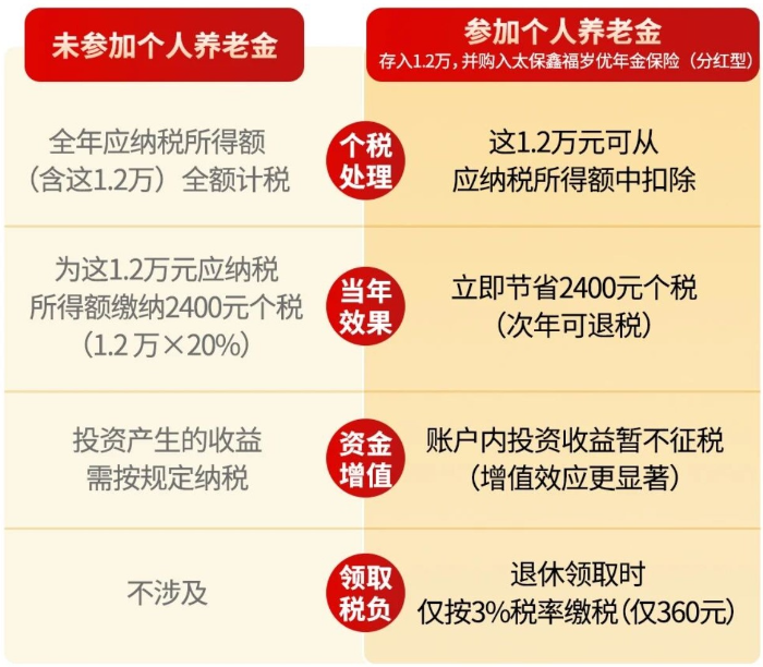 以一位適用20%個人所得稅稅率的職場人為例,省稅效果一目了然:參加與否,差異巨大。