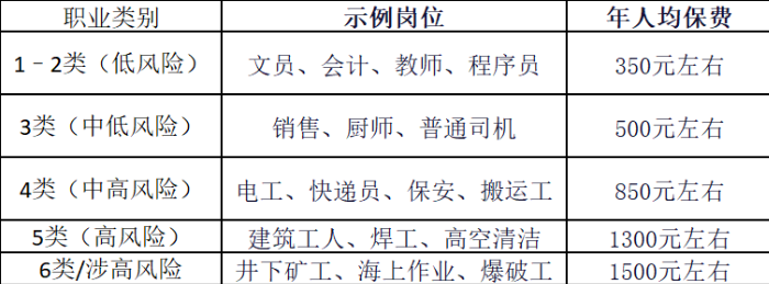 團體意外險的保費受職業類型影響較大,以50萬身故/傷殘保額+5萬意外醫療(不限社保)為例,市場上各職業類別的年人均保費情況如下: