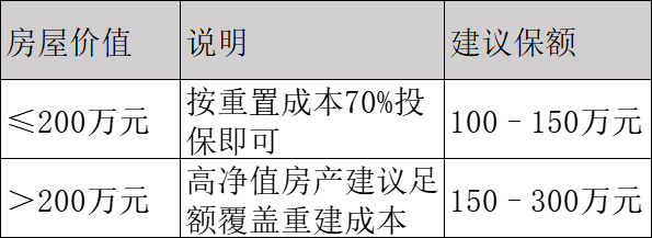 房屋主體保額按市場(chǎng)估值設(shè)定,通常為房產(chǎn)總價(jià)的60%-80%,新房可按購(gòu)房?jī)r(jià)投保;