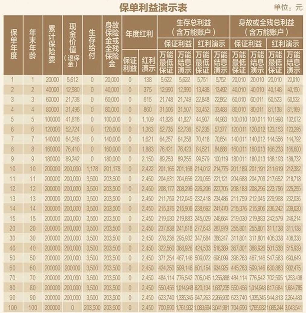 注:1.紅利分配分別按保證利益、紅利演示2種情況進行預測,僅作為參考之用。紅利演示不作為未來紅利分配的保證,實際紅利水平可能高于或低于表中所列數字;2.為了便于說明,假定合同生效日為1月1日;3.累積紅利的累積利率為1.75%,是假設值,公司每年公布的累積利率可能高于或低于該利率;4.以上演示的被保險人年齡、生存給付(包含祝福金、滿期金)為保單年度末且經過完整保單年度的值;5.現金價值(退保金)、身故保險金為保單年度末且經過品整保單年度的值,保單年度中的現金價值(退保金)、身故保險金可能高于或低于該數值,現金價值(退保金)不包含當年給付的祝福金及滿明保險金;6.萬能賬戶價值按照假設的結算利率計算,最低保證、結息演示兩檔的結算利率假設分別為1.0%(最低保證利率)、3.0%,萬能臉的最低保證利率之上的投資收益是不確定的,實際保單賬戶利益可能低于萬能結息利益演示水平;7.合同生效日對應日派發的相關利益計入上一保單年度末;8.演示數據保留整數。