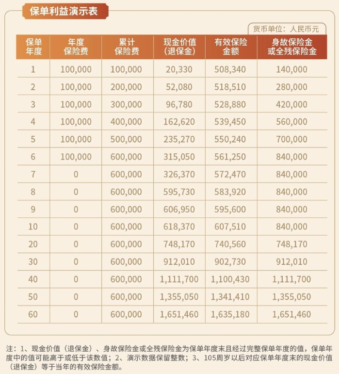 45周歲的王先生為自己投保了“太保盛世傳家終身壽險”,選擇了6年交,年交保險費100,000元,保險期間終身。