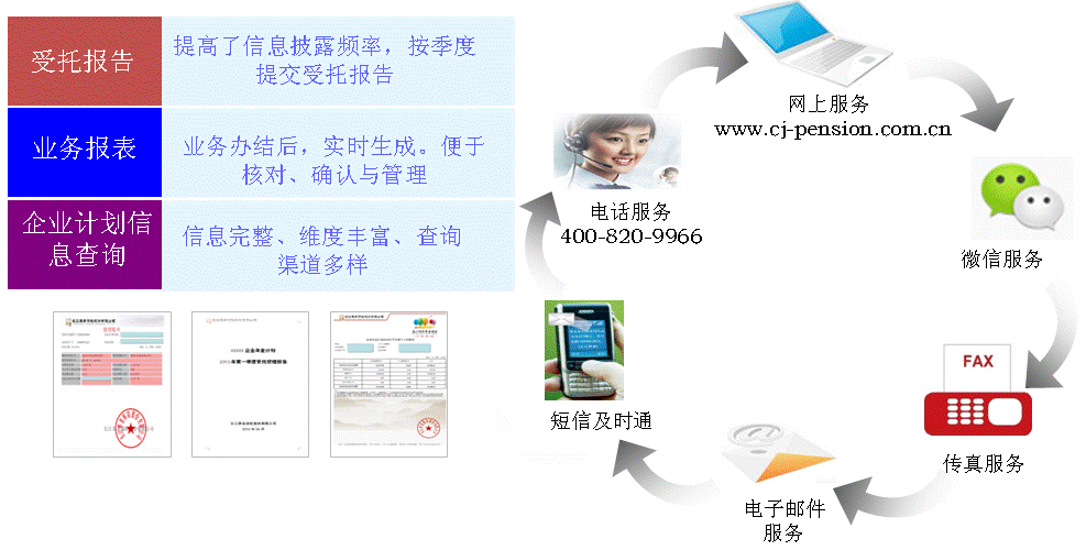 為保證客戶及時(shí)了解計(jì)劃運(yùn)作情況,長(zhǎng)江養(yǎng)老利用網(wǎng)上、電話、短信、電子郵件、微信等多種現(xiàn)代化的通訊方式提供全方位的查詢披露服務(wù),并能根據(jù)客戶需要量身提供個(gè)性化報(bào)表服務(wù)。企業(yè)還可自助定制短信及郵件信息種類,長(zhǎng)江養(yǎng)老提供包括業(yè)務(wù)辦理結(jié)果提醒、服務(wù)信息通知、問(wèn)題件提醒等在內(nèi)的短信及郵件服務(wù)。