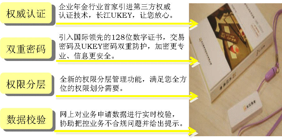 長(zhǎng)江養(yǎng)老在信息安全和業(yè)務(wù)風(fēng)險(xiǎn)防控技術(shù)方面位于行業(yè)前列,不僅率先在業(yè)內(nèi)引進(jìn)第三方權(quán)威數(shù)字認(rèn)證技術(shù),還根據(jù)養(yǎng)老金業(yè)務(wù)特點(diǎn),開(kāi)發(fā)設(shè)置了網(wǎng)上交易密碼、經(jīng)辦人權(quán)限分層管理、業(yè)務(wù)數(shù)據(jù)實(shí)時(shí)校驗(yàn)等風(fēng)險(xiǎn)防控措施。一系列技術(shù)手段結(jié)合成的隱形安全屏障,能有效防止企業(yè)年金信息外泄,極大提高業(yè)務(wù)辦理的安全性,令企業(yè)樂(lè)享安心無(wú)虞的年金服務(wù)。
